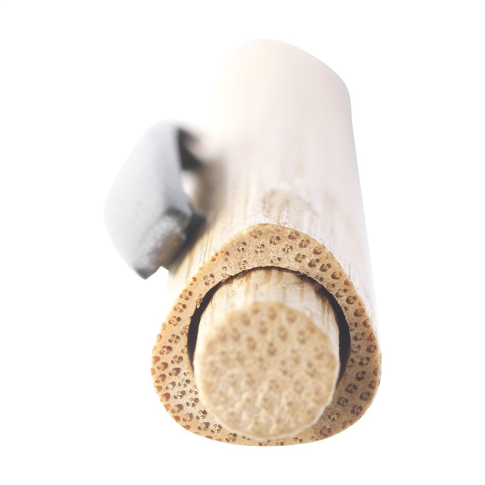 Blauschreibender Kugelschreiber mit wunderschönem Halter aus FSC 100% zertifiziertem Bambus. Durch die dreieckige Form liegt der Stift sehr angenehm in der Hand. Wunderschön verarbeitet mit Druckknopf aus Bambus und Metallclip.