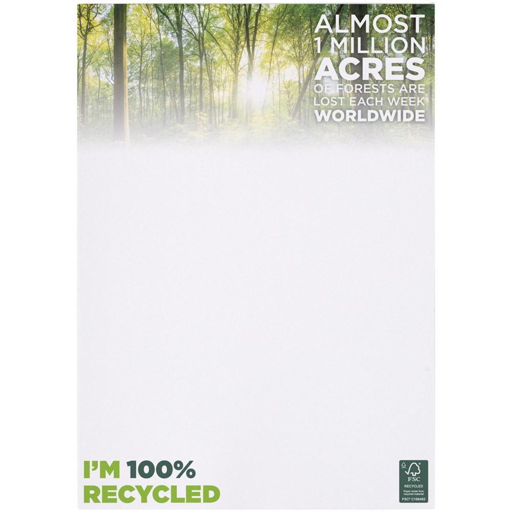 Weißer Desk-Mate® A4 Notizblock mit 80g/m2 recyceltem Papier. Ein vollfarbiger Druck auf jedem Blatt möglich. Erhältlich in 3 Größen: 25, 50, 100 Blatt.