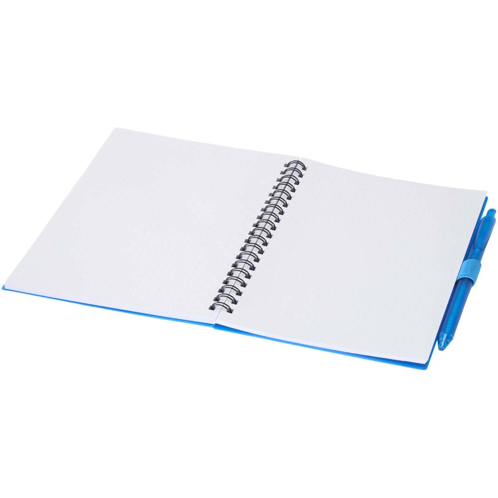 Das Niove Softcover-Notizbuch besteht aus recyceltem Kunststoff und enthält 70 punktkarierte Seiten aus 70 g/m² Papier. Das Notizbuch hat abgerundete Ecken und eine Stiftschlaufe. Notizbuchformat: 140 × 178 mm. Der Kugelschreiber besteht ebenfalls aus recyceltem Kunststoff. Tintenfarbe: Blau. Schreiblänge: 1000 Meter. Schreibspitze: 1,0 mm.