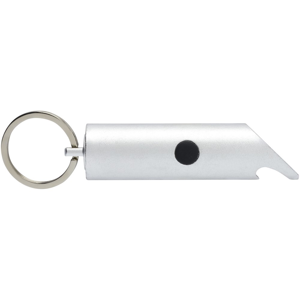 Helle LED Schlüsselleuchte mit Flaschenöffner, Ein-/Ausschalttaste und einem geteilten Schlüsselring. Sie ist aus leichtem und stabilem, zu 63% RCS-zertifiziertem, recyceltem Aluminium hergestellt. Der Recycled Claim Standard (RCS) prüft den Recyclinganteil eines Produkts über die gesamte Lieferkette hinweg. Erhältlich in einer Vielzahl von auffälligen Farben mit Metallic-Finish, die ein aufgedrucktes Logo besonders gut zur Geltung bringen. Wird mit drei LR44 Batterien geliefert.