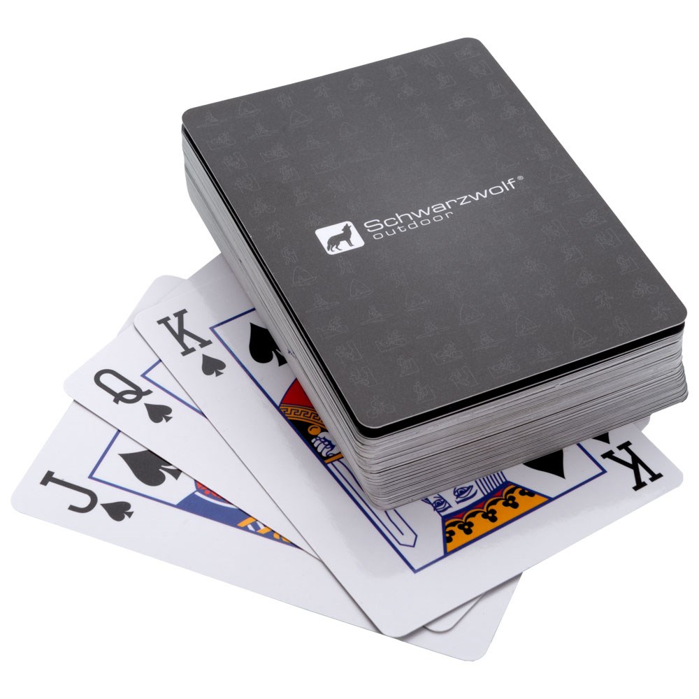 einfach zu Hause mit Ihrer Familie genießen können. Das Set enthält 54 Spielkarten mit wasserabweisender Oberflächenbehandlung, 6 Würfel, 15 Notizzettel und einen Stift. Verpackt in einer Schwarzwolf outdoor Geschenkbox.