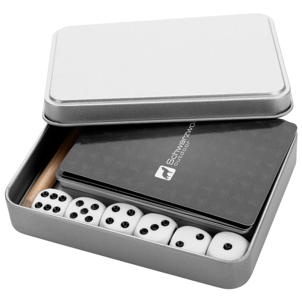 Schwarzwolf outdoor Reiseset, bestehend aus Spielkarten und Würfeln in einer Blechdose. Sie werden dieses Set sicherlich zu schätzen wissen, zum Beispiel während Ihres Campingausflugs, wenn Sie und Ihre Freunde den Abend bei einem lustigen Spiel oder