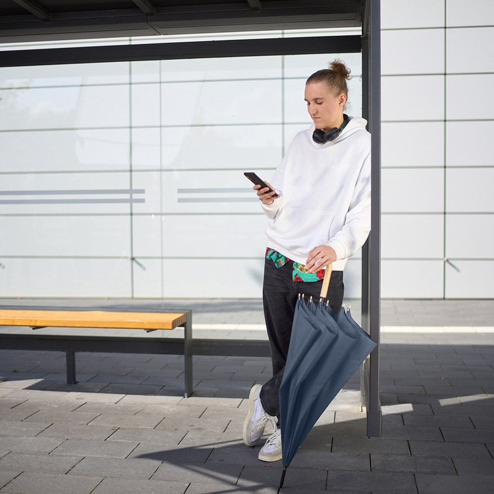 | Material: | Bezug: 100% Polyester-Pongee (recycelt & waterSAVE®) Griff: Echtholz Stock: Stahl |