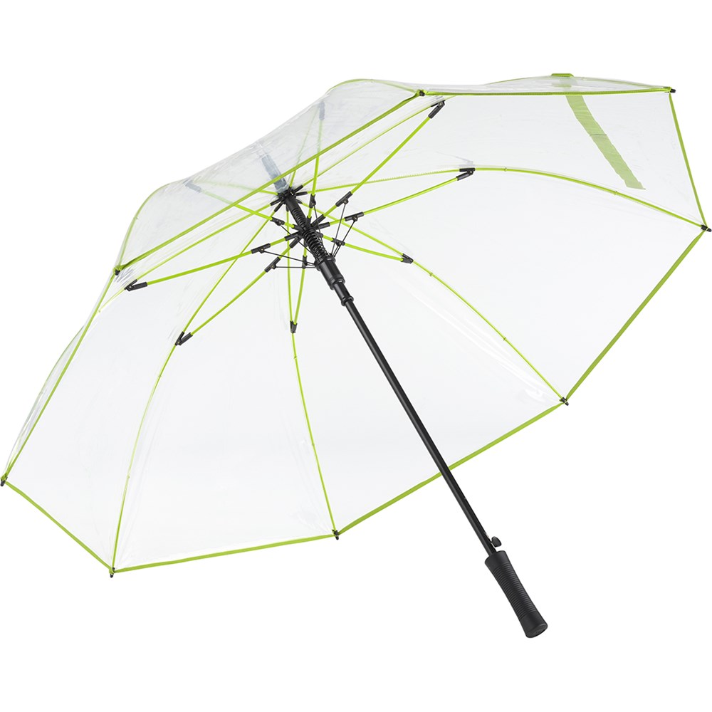 Ansprechender Automatik-Gästeschirm für zwei Personen mit transparentem Bezug und farbigen Details Komfortable Automatik-Funktion zum schnellen Öffnen, hochwertiges Windproof-PLUS-System für eine maximale Gestell-Flexibilität bei stärkeren Windböen, flexible Fiberglasschienen, farblich aufeinander abgestimmte Design-Elemente, matt-schwarzer gerader Kunststoffgriff mit Werbeanbringungsmöglichkeit, höherer Korrosionsschutz durch schwarze Galvanisierung des Stahlstocks