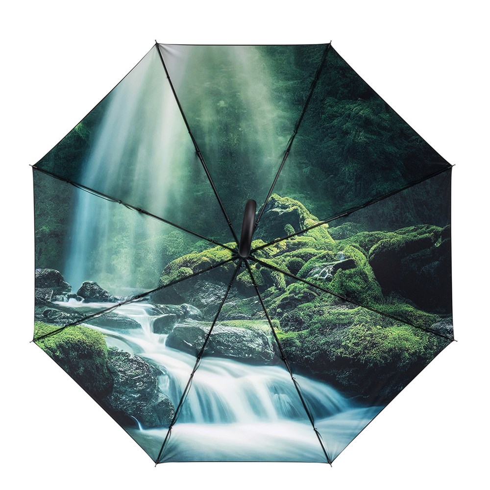 Neutraler Automatik-Stockschirm mit farbigem Motiv-Innendruck Komfortable Automatik-Funktion zum schnellen Öffnen, hochwertiges Windproof-PLUS-System für eine maximale Gestell-Flexibilität bei stärkeren Windböen, flexible Fiberglasschienen, von außen beschichteter Bezug mit Transferdruck innen, Soft-Touch-Rundhakengriff mit integrierter Auslösetaste und Werbeanbringungsmöglichkeit, höherer Korrosionsschutz durch schwarze Galvanisierung des Stahlstocks. Einige Farben auch als Taschenschirm (Art. 5593) erhältlich.