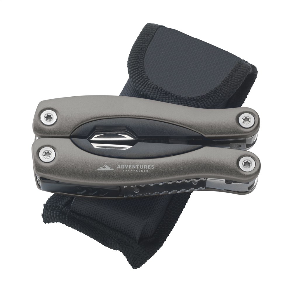 Kompakte Multizange aus Edelstahl mit Aluminiumhandgriff in Metallic-Look. 9-teilig mit 13 Funktionen: Zange, Isolierzange, 3 Schraubenzieher, Kreuzschraubenzieher, Feile, Säge/Fischentschupper, Messer, Reibahle, Dosenöffner und Kapselheber. In einem 600D Nylonetui.Beachten Sie, dass möglicherweise lokale Vorschriften für den Besitz und / oder das Tragen von Messern oder Multitools in der Öffentlichkeit gelten. Wird einzeln in einem Kraftkarton geliefert.