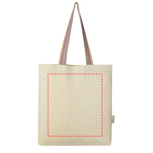 Die Rainbow Tragetasche mit 180 g/m² ist ein echtes Upgrade zur normalen Baumwolltragetasche. Diese Einkaufstasche aus Recyclingbaumwolle und -polyester ist hergestellt aus Produktionsresten und hat 25 cm lange Tragegriffe aus regenbogenfarbenem Gurtband und eine 3,5 cm breite Standfläche. Sie bietet somit mehr Stauraum. Belastbar bis zu 5 kg.