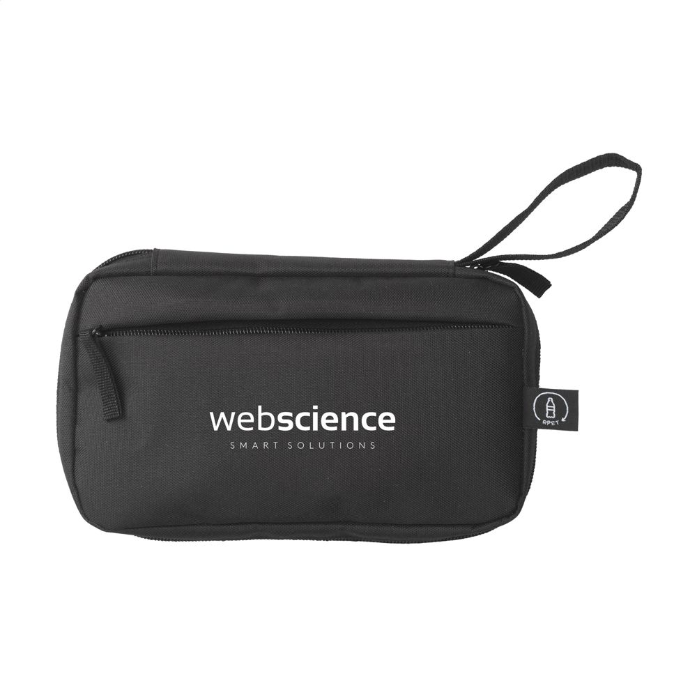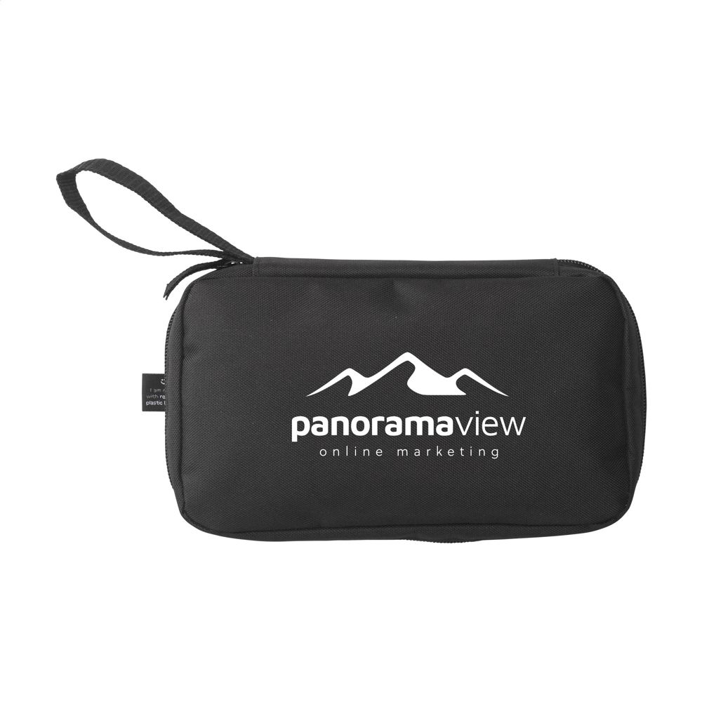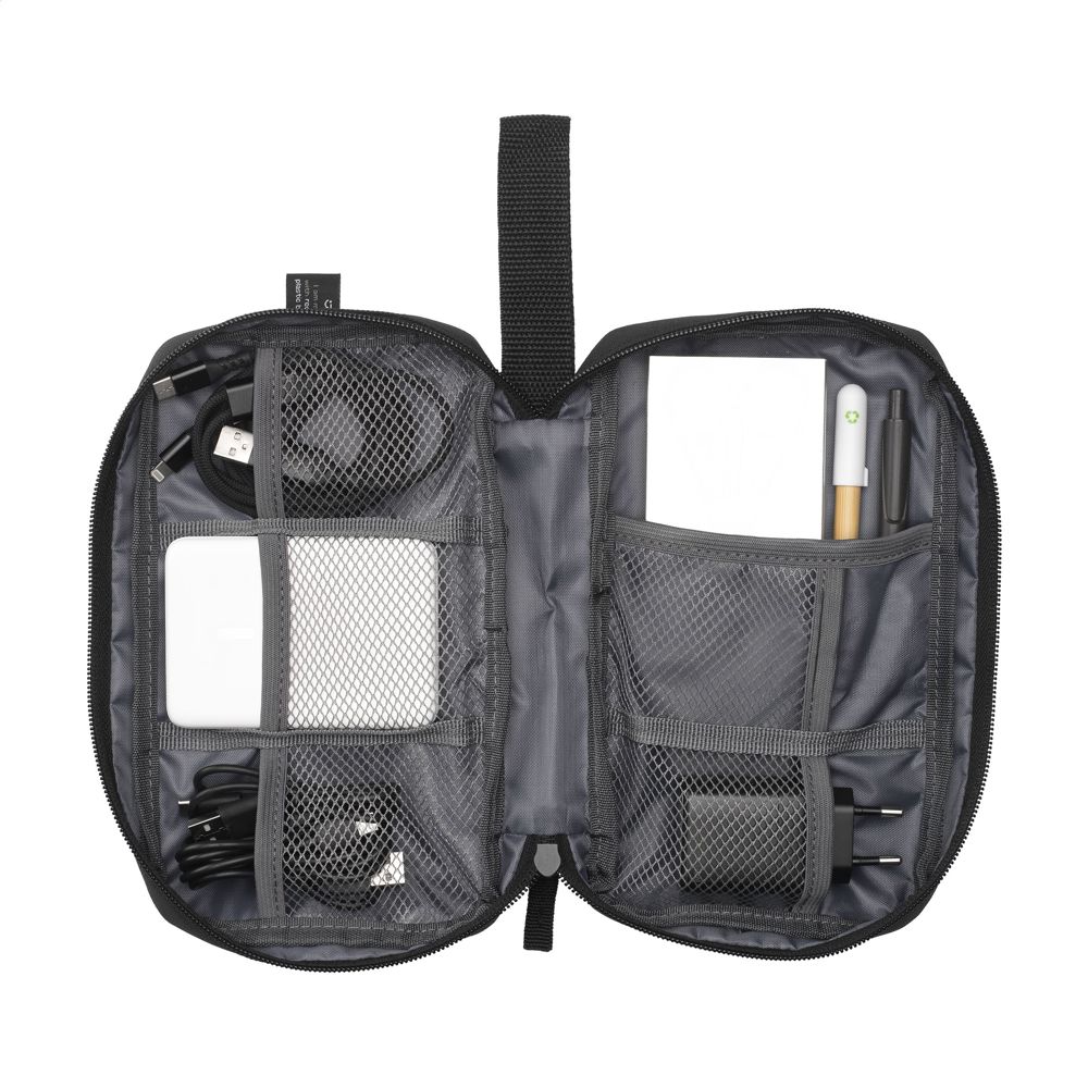 Etui zur geordneten und übersichtlichen Aufbewahrung von Kabeln, Ladegeräten und technischem Zubehör. Hergestellt aus 600D RPET-Polyester. Das Innere bietet reichlich Stauraum, unterteilt in mehrere (Netz-)Fächer. Mit Reißverschluss, einer zusätzlichen Reißverschlusstasche an der Außenseite und einer praktischen Trageschlaufe. Ideal für Reisen, aber auch praktisch für zu Hause oder im Büro. GRS-zertifiziert. Gesamtes recyceltes Material: 88%.
