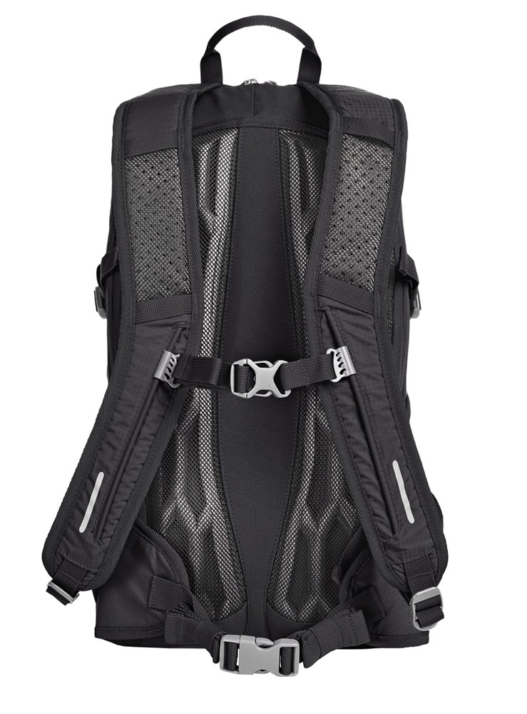 leichter, funktioneller Tages- und Bike-Rucksack mit innovativem Waben-Rückensystem für ideale Belüftung und Polsterung; höhenverstellbarer Brustgurt; seitlich gepolsterter Beckengurt; großes 2-Wege-Reißverschluss-Hauptfach mit flachem Einsteckfach innen; rückseitiger Ausgang geeignet für z.B. Kopfhörer oder Schlauch des zusätzlich lieferbarem Trinksystems (Artikel 1812216); Klettloop zur Fixierung des Trinkschlauches; 2 Reißverschlussvortaschen; 2 Netz-Seitentaschen; seitliche Zurrgurte; funktionales Schlaufenband auf der Fronttasche; dekorativer Reflex-Aufdruck, Handgriff