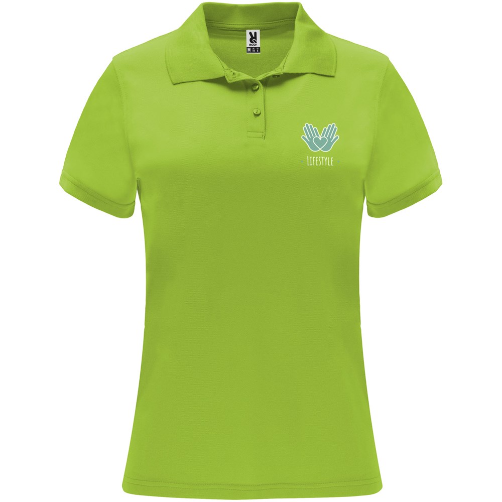 Kurzärmeliges Funktions-Poloshirt für Damen. Gestrickter Kragen mit 3-Knopfleiste. Figurbetonte Passform. Atmungsaktives, leicht zu waschendes und zu trocknendes Material. Herausnehmbares Etikett. Technisches Gewebe. Atmungsaktiver Stoff. Das Modell ist 173 cm groß und trägt Größe S.