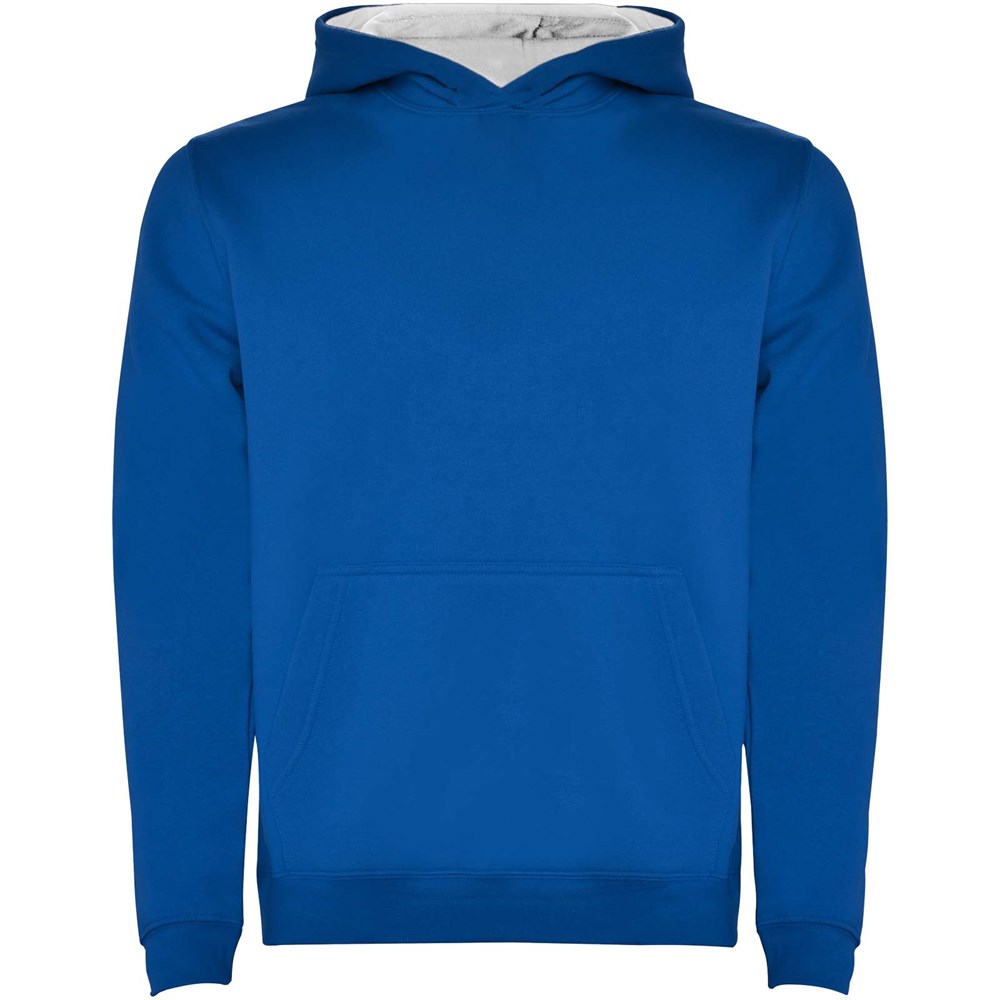 Zweifarbiger Kapuzenpullover mit doppeltem Stoff. Verstärkte und verdeckte Nähte am Kragen und an der Kängurutasche. Elastischer 1×1-Rippstrick an Ärmeln und Bund. Herausnehmbares Etikett. Das Modell ist 120 cm groß und trägt Größe 5/6.