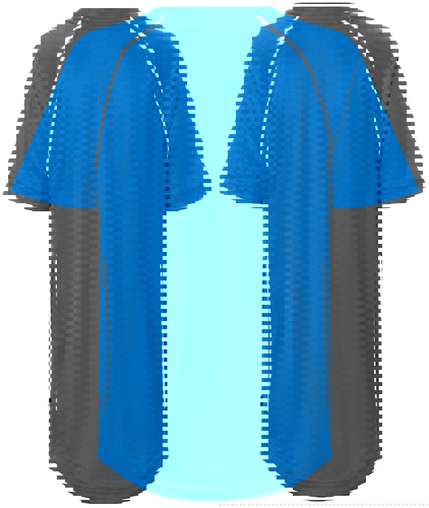 Atmungsaktiv und schnell trocknend Strapazierfähig, pflegeleicht, leicht und komfortabel Kontrastfarbige Paspel Größe: 104 1/2 Oberweite: 35 cm 1/2 Saumweite: 35 cm Länge ab Schulter Vorderteil: 42 cm Länge ab Schulter Rückenteil: 45 cm Ärmel Länge inkl. Schulter: 24 cm Raglan Atmungsaktiv V-Ausschnitt Sublimations-Textilien