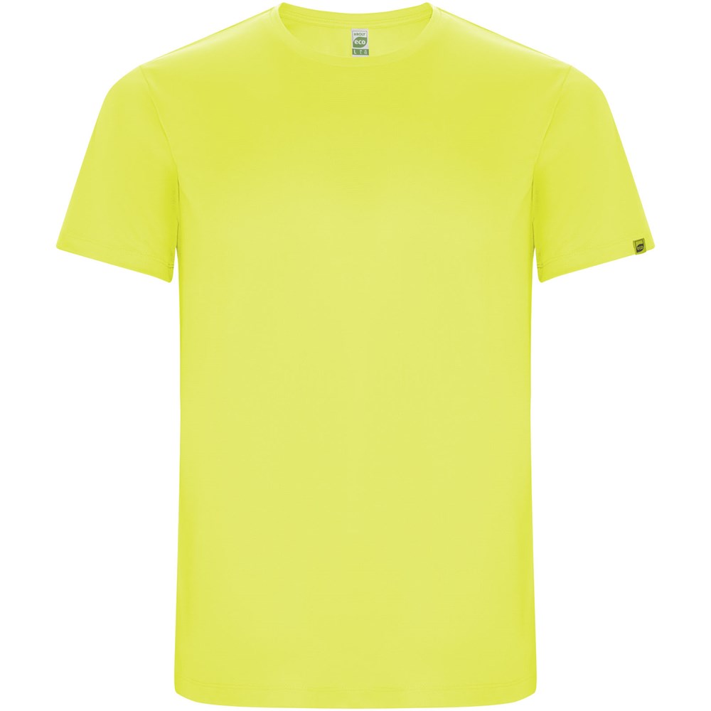 Funktions-T-Shirt aus recyceltem Polyester CONTROL DRY. Rundhalsausschnitt mit farblich abgesetzten Nähten. ECO-Logo-Etikett am Ärmel. Verpackung aus Recyclingmaterial. Herausnehmbares ECO-Etikett. Verpackung aus Recyclingmaterial. Technisches Gewebe. Das Modell ist 180 cm groß und trägt Größe M.