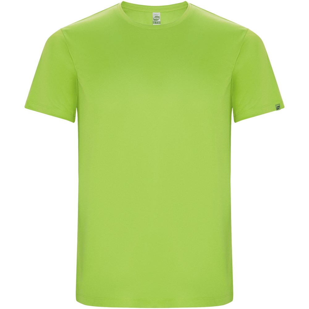 Funktions-T-Shirt aus recyceltem Polyester CONTROL DRY. Rundhalsausschnitt mit farblich abgesetzten Nähten. ECO-Logo-Etikett am Ärmel. Verpackung aus Recyclingmaterial. Herausnehmbares ECO-Etikett. Verpackung aus Recyclingmaterial. Technisches Gewebe. Das Modell ist 180 cm groß und trägt Größe M.
