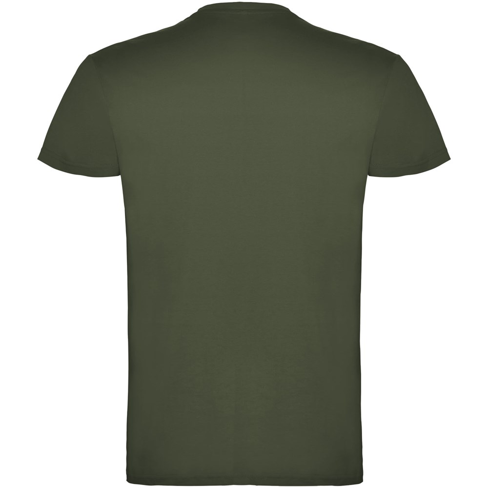 Kurzärmeliges T-Shirt mit doppellagigem Rundhalsausschnitt aus Elasthan, hergestellt aus schlauchförmigem Material für Erwachsene. Verstärkte und verdeckte Nähte am Kragen. Herausnehmbares Etikett. Das Modell ist 190 cm groß und trägt Größe L.