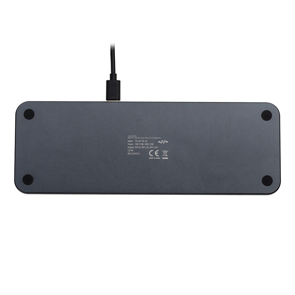 Auf dieser Ladestation können bis zu drei induktive Geräte gleichzeitig aufgeladen werden. Verfügbar sind zwei Ladeflächen mit je bis zu 15 Watt Ausgangsleistung für Handys, Wireless Kopfhörer oder andere Endgeräte. Eine davon ist mit einem Magnetring ausgestattet, der dem Endgerät einen sichereren Halt ermöglicht. Zwischen den beiden Ladeflächen liegt noch eine Ladefläche mit 2,5 Watt, die speziell für Apple® Watch gedacht ist. Mit der hohen Leistung ist das schnelle Aufladen gewährleistet.