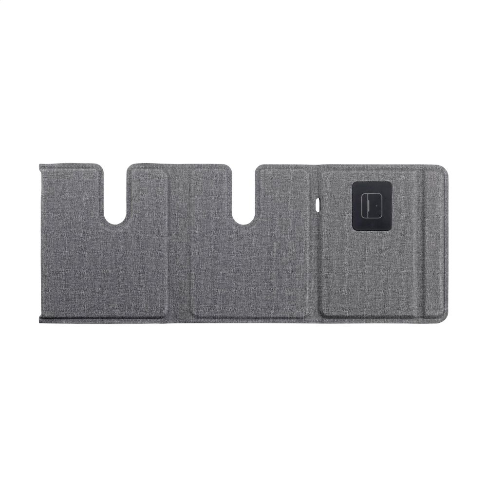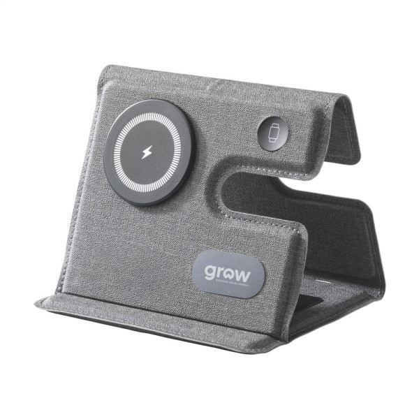 Magnetisches, kabelloses 3-in-1-Ladegerät (15 W) aus recyceltem ABS und recyceltem PU mit grauem Mischmuster. Diese Ladestation unterstützt schnelles kabelloses Laden: 15 W für ein Mobiltelefon, 2,5 W für Ihre iWatch und 3 W für TWS-Kopfhörer. Eingang: 1 x USB-C 9V/3A. Das eingebaute, magnetische Schnellladegerät ist mit allen Geräten kompatibel, die kabelloses Laden nach Qi unterstützen. Stellen Sie diese Dockingstation auf Ihren Schreibtisch und Ihr Arbeitsplatz bleibt aufgeräumt und Ihre Geräte geladen. Zusammenklappbar und leicht zu transportieren. Inklusive USB-C/USB-C-Ladekabel und Gebrauchsanweisung. RCS-zertifiziert. Gesamtes recyceltes Material: 49%. Verpackt pro Stück.